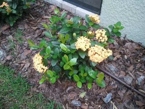 Is moderately salt tolerant, but not at all tolerant of alkaline soils, which will cause the leaves to become chlorotic (yellowish). Don’t plant iwhere it will get runoff from concrete or stucco. Do plant in acidic soil, feed with a high nitrogen fertilizer and mulch well. They do well in partial shade in the warmest areas. It does best, however, with full sun most of the day, but some shade during the hottest hours. Plants in more sun will be denser and more compact, and produce more flowers. Ixora likes high humidity and a moist, well drained soil that is high in organics. During warm weather they should be watered regularly. Water sparingly in winter. If temperatures dip into the thirties F, leaves and small twigs will be damaged. Light freezes may kill the plant to the ground, but it usually sprouts back in spring.