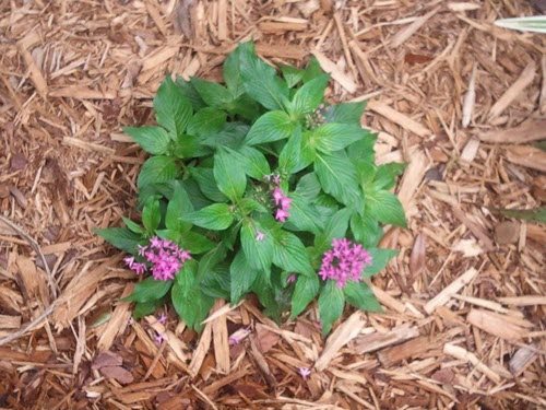 Dark green, lance-shaped, somewhat furry and deeply veined leaves provide a lush backdrop for prolific clusters of never-ending, five-petaled flowers. These may be red, white, lavender, purple, or shades of pink. Extremely attractive to butterflies, and delight hummingbirds. Depending on the variety, the habit of growth may be upright to about 3′, or low and mounding. Full sized pentas are often sprawling, as tall stems will topple over. The flowers are held in terminal clusters and self-deadhead. In warm weather the plant grows fast and stays in bloom constantly. Where winters are not too severe, pentas are perennial. They may always be treated as an annual and replanted after danger of frost for long-lasting summer color. Blooms better and is more robust in good sun, but will still bloom in shade and look good!